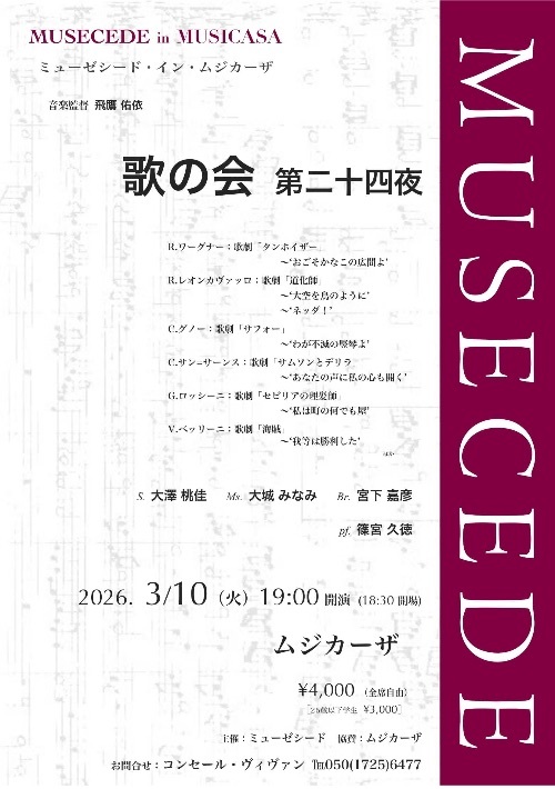 CONCERTS ムジカーザ ミューゼシード ガルバホール 歌劇座十二社 hall60(ホールソワサント) リュミエール・ジャポン hall60(ホールソワサント) リュミエール・ジャポン としま区民センター小ホール アトリエ・エル ムジカーザ ミューゼシード ベヒシュタイン セントラム東京 ミューゼシード ガルバホール 歌劇座十二社 ムジカーザ ミューゼシード お電話でのお問合せ コンセール・ヴィヴァン TEL 050-1725-6477